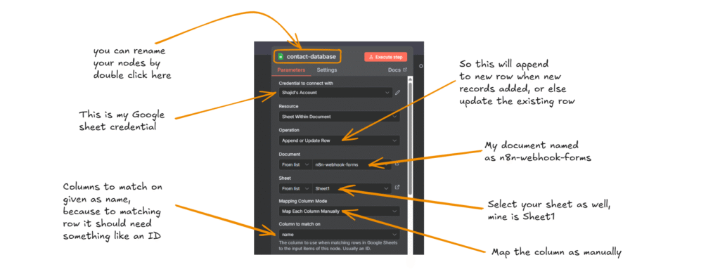 - Google Sheet Node: Append or update the row
